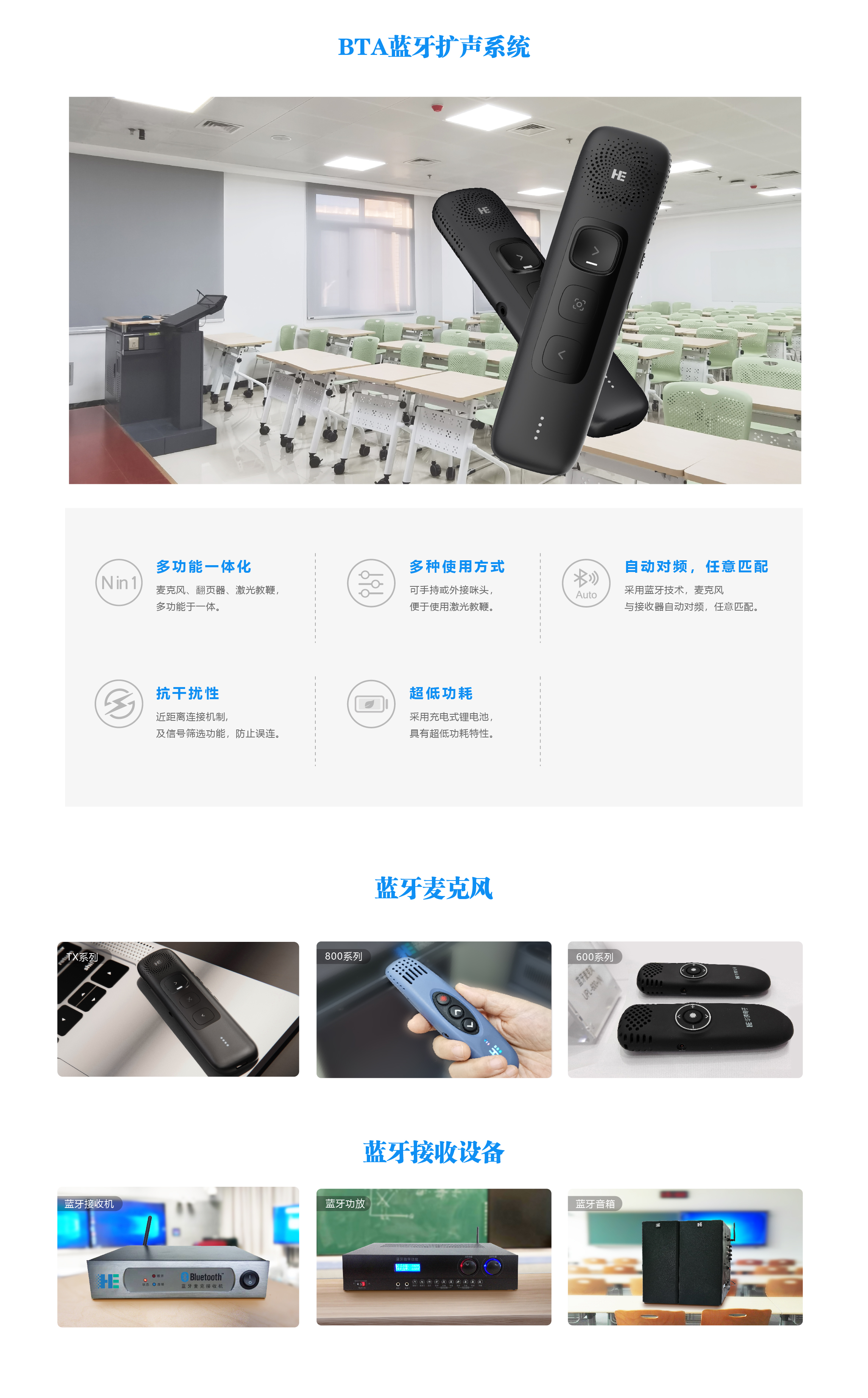 BTA蓝牙扩声系统,采用国际通用、标准的蓝牙通讯协议,具有自动对频、任意匹配的特性,可以实现“一师一麦”的应用模式,免借还、免管理,专用卫生。系统性能稳定、抗干扰能力强,可实现走下讲台授课的需求。除本地扩声以外,还可为线上教学提极佳的音质效果,满足各种教学场景使用需求。